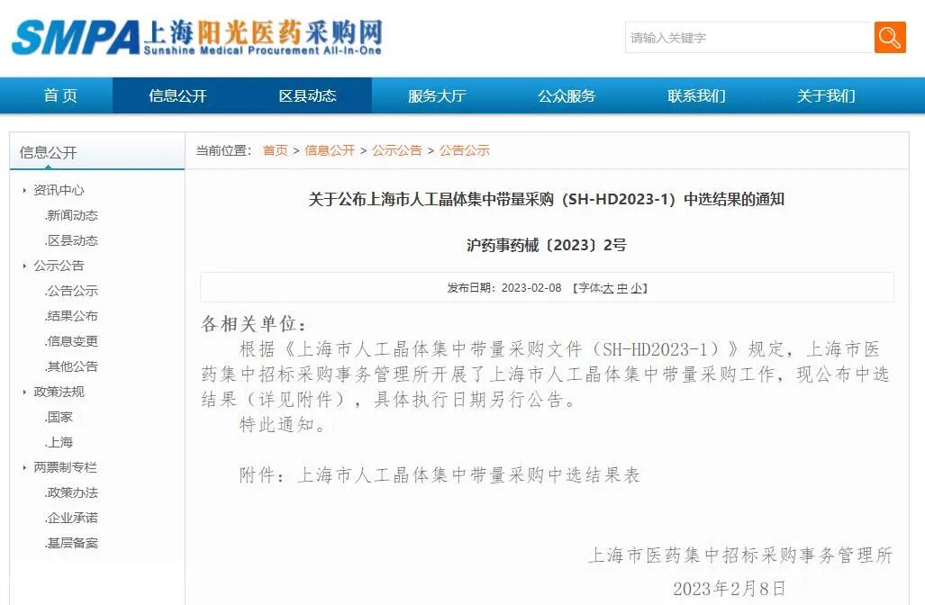关于公布上海市人工品体集中带量采购 (SH-HD2023-1) 中选结果的通知